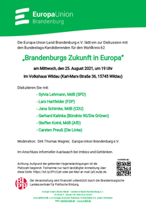 Die Europa-Union Brandenburg e.V. lädt ein zu einer Diskussion mit den Bundestags-Kandidierenden für den Wahlkreis 62 am 25. August 2021 in Wildau.