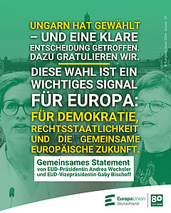 Berlin, 13.04.2026 - Die Europa-Union Deutschland würdigt die Wahlen in Ungarn als wichtiges Signal für die demokratische Entwicklung in Europa. Die Beteiligung der Bürgerinnen und Bürger und das klare Bekenntnis zu europäischen Werten unterstreichen die Bedeutung freier und fairer Wahlen für die Zukunft der Europäischen Union.