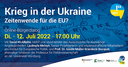 Wie kann die EU in der Sicherheits- und Verteidigungspolitik handlungsfähiger werden? Brauchen wir eine Reform der EU-Erweiterungspolitik? Darüber möchten wir mit Ihnen beim letzten digitalen Bürgerdialog vor der Sommerpause zum Thema "Krieg in der Ukraine: Zeitenwende für die EU?" sprechen. Schalten Sie sich ein und diskutieren Sie mit David McAllister, MdEP und Vorsitzender des Ausschusses für Auswärtige Angelegenheiten, Ljudmyla Melnyk, Senior Projektleiterin und wissenschaftliche Mitarbeiterin im Projekt "German-Ukrainian…