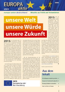 Pünktlich vor der Europawoche erscheint wieder unsere Mitgliederzeitschrift Europa aktiv. Die aktuelle Ausgabe berichtet über das Europäische Jahr für Entwicklung 2015 und die Pläne der EU-Mitgliedstaaten gegen eine Abschaffung der Roaming-Gebühren. Weitere Beiträge beschäftigen sich mit der Europäischen Verteidigungspolitik, dem transatlantischen Freihandelsabkommen TTIP und dem Osten Europas. In der Ausgabe 2-2015 finden Sie außerdem wieder Neuigkeiten aus den Landes- und Kreisverbänden und von unserem Jugendverband, den Jungen…