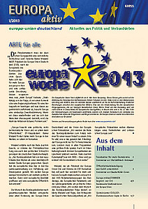 Die neue Ausgabe unserer Mitgliederzeitung ist da. In Europa aktiv 1-2013 geht es u.a. über unsere Kampagne Europa mitbeSTIMMEN, das mangelhafte Wahlrecht für EU-Bürger in Deutschland und die Europäische Bürgerinitiative "Let me vote". Außerdem lesen Sie dort zahlreiche Berichte aus unseren Landes- und Kreisverbänden.