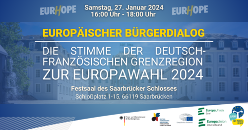 Gemeinsam mit unserem Landesverband Europa-Union Saar laden wir Sie ganz herzlich zu unserem Europäischen Bürgerdialog "Die Stimme der deutsch-französischen Grenzregion zur Europawahl 2024" am 27. Januar 2024 in Saarbrücken ein. Kommen Sie ins Gespräch unter anderem mit Manuela Ripa, Mitglied des Europäischen Parlaments, Peter Gillo, Direktor des Regionalverbands Saarbrücken, und Roland Theis, Abgeordneter des saarländischen Landtags.