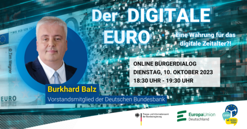 Diese und weitere Fragen möchten wir gerne mit Ihnen in unserem nächsten Online-Bürgerdialog „Der Digitale Euro – Eine Währung für das digitale Zeitalter?!“ am 10. Oktober 2023 gemeinsam mit dem Bundesbankvorstand Burkhard Balz diskutieren.