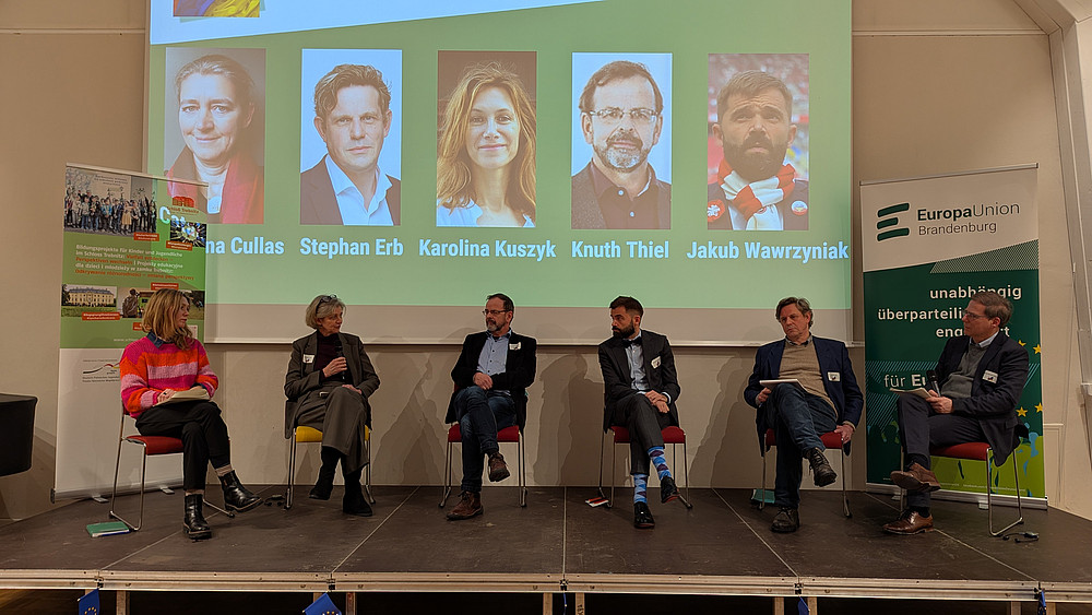 Direkt daran anknüpfend folgten unter Moderation von Johannes Kohls, Vorstandsmitglied der Europa-Union Brandenburg, zwei Impulsreferate von Małgorzata Gemen, Leiterin des Berliner Büros des Polnischen Instituts für Internationale Angelegenheiten, und Botschafterin Catalina Cullas, Beauftragte des Auswärtigen Amts für die Beziehungen zu den Mitgliedstaaten der EU sowie für grenzüberschreitende und regionale Zusammenarbeit.