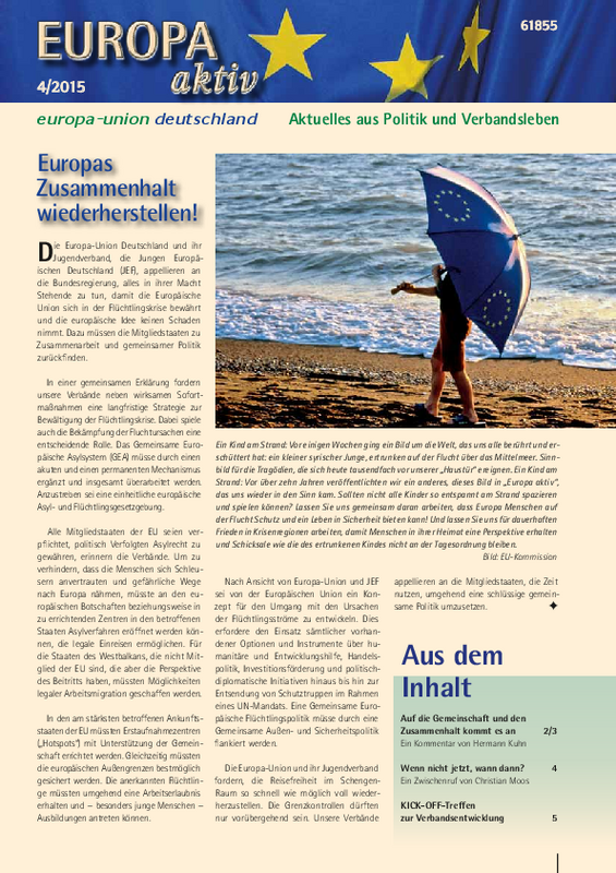 Die Ausgabe 4-2015 von Europa aktiv berichtet über neue Initiativen des Bundesverbandes in den Bereichen Verbandsentwicklung und Kommunalpolitik. Neben vielen Neuigkeiten aus den Landes- und Kreisverbänden finden Sie dort auch den aktuellen Appell von EUD und JEF zur Flüchtlingspolitik, den Zwischenruf von Generalsekretär Christian Moos „Wenn nicht jetzt, wann dann?“ zu den aktuellen Herausforderungen in Europa sowie den Kommentar von Präsidiumsmitglied Hermann Kuhn zum „Fünf-Präsidenten-Papier“.