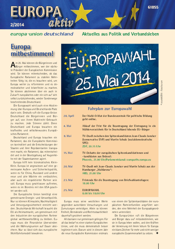 Die neue Ausgabe unserer Verbandszeitschrift steht ganz im Zeichen der Europawahl. In Europa aktiv 2-2014 finden Sie Beiträge über das Europäische Parlament und seine zahlreichen Errungenschaften, Analysen zur aktuellen Lage vor den Wahlen sowie einen Fahrplan mit den wichtigsten Terminen bis zum 25. Mai 2014.