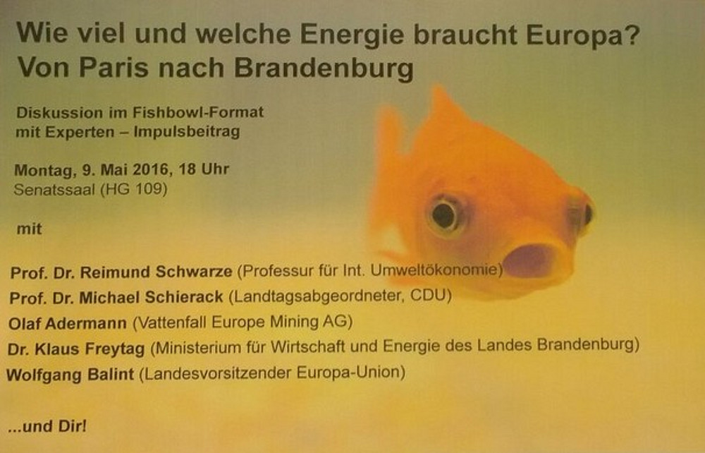 Gastgeber Prof. Dr. Reimund Schwarze (Europa-Union Viadrina, Professur für Volkswirtschaftslehre, insb. Internationale Umweltökonomie), konnte für ein Impulsreferat gewonnen. Mit ihm diskutieren anschließend Prof. Dr. Michael Schierack (Mitglied des Brandenburgischen Landtages, CDU) Dr. Klaus Freytag (Ministerium für Wirtschaft und Energie des Landes Brandenburg, Abteilungsleiter Energie und Rohstoffe) Wolfgang Balint (Landesvorsitzender der Europa-Union) Olaf Adermann (Vattenfall Europe Mining AG).